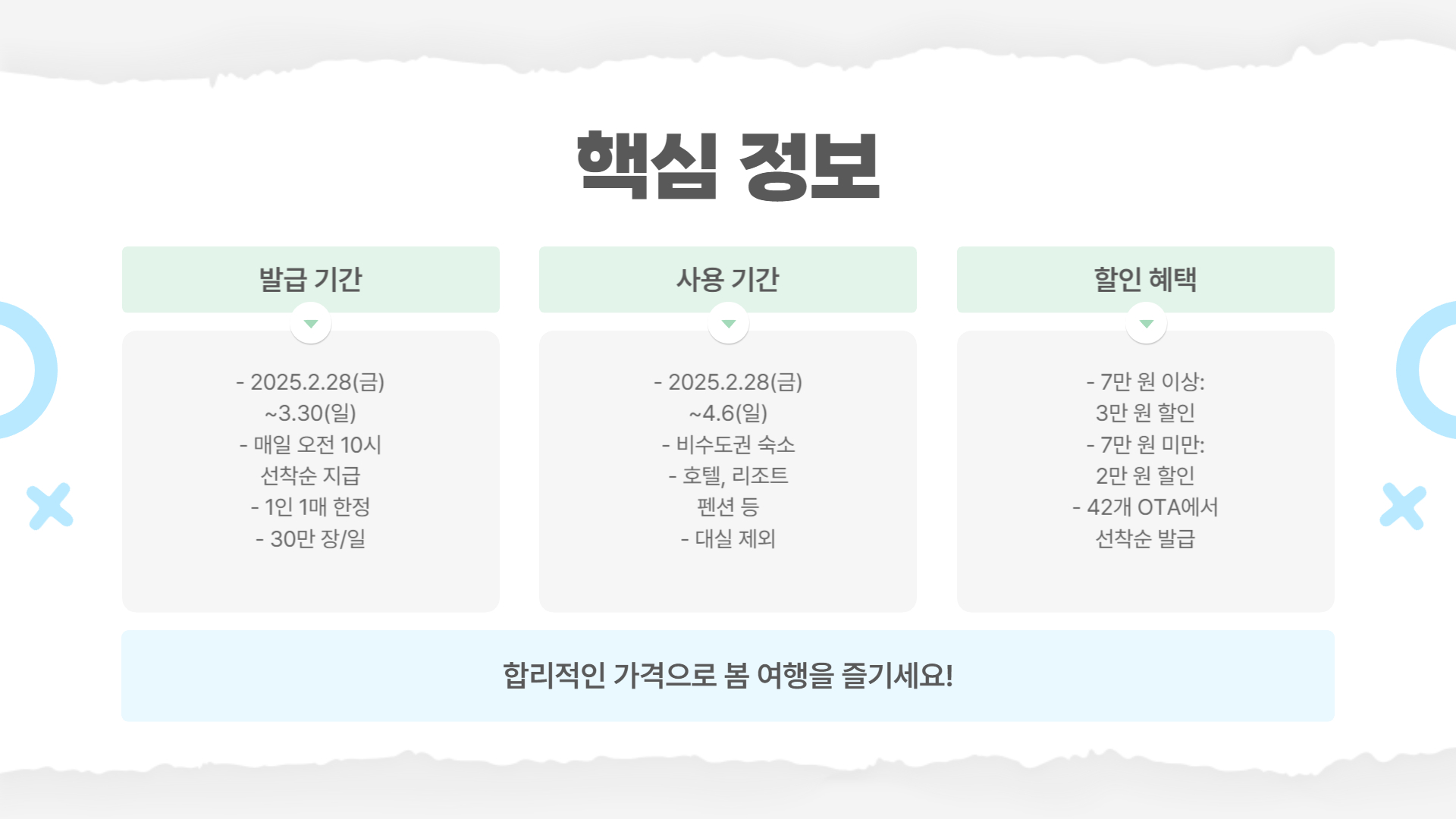 2025 대한민국 봄맞이 숙박세일 페스타는 국내 여행을 합리적인 가격으로 떠날 수 있는 절호의 기회입니다. 매일 오전 10시, 선착순 할인권을 꼭 챙기세요!