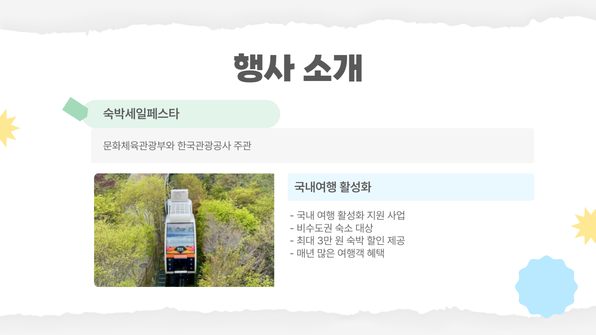 숙박세일페스타는 문화체육관광부와 한국관광공사가 주관하는 국내 여행 활성화 지원 사업입니다. 서울, 경기, 인천을 제외한 비수도권 숙소를 대상으로 숙박 할인권을 제공하며, 매년 많은 여행객들이 혜택을 누리고 있습니다.