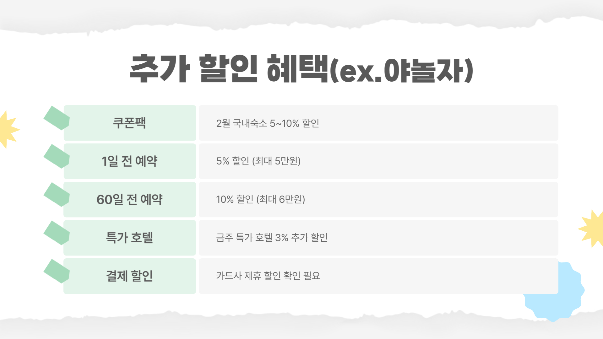 - 숙박 추가 할인: 2월 국내숙소 5~10% 할인(최대 6만 원 할인)