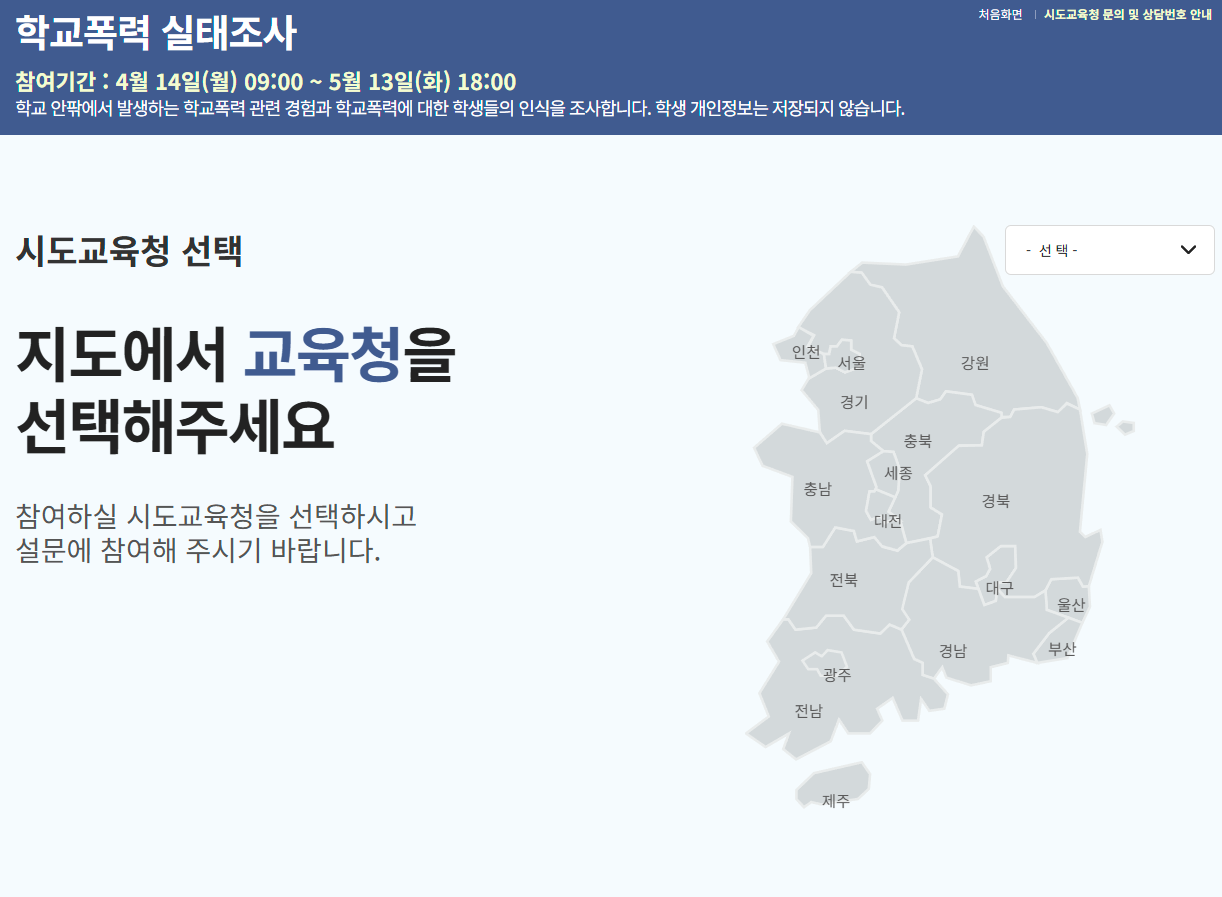 카테고리 없음 학교폭력실태조사 누리집 사이트 바로접속 by storyboing 2025. 4. 16. 학교폭력 실태조사 누리집 사이트 바로접속 설문하기 공유하기 게시글 관리 알면즐거운지식세상